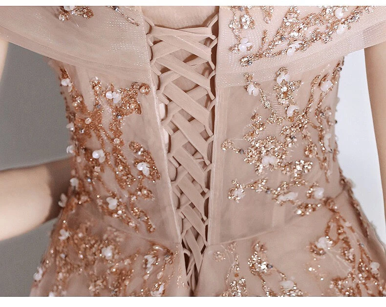 La robe en tulle vintage enchante tous vos sens avec son look floral qui vous emmènera au sein des années 80. Les applications brillantes et la garniture de perles brodées de haute qualité à la taille promettent une apparence glamour inoubliable. Le beau col en V sur le bustier et sur le dos donne une certaine légèreté et complète ainsi un univers de royauté interprété avec modernité.