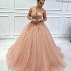 Une robe de soirée spéciale en rose pâle rafraîchissant pour une apparence glamour ! Le haut richement brodé avec des applications en dentelle florale blanche offrant un magnifique décor à votre tenue chic. Un bijou réalisé sur mesure à la main avec une grande minutie disposant d’une traine circulaire offrant un aspect majestueux et formel pour attirer de nombreux regards admiratifs.