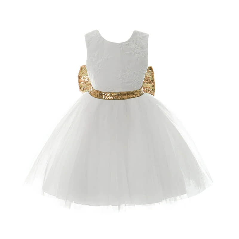 La robe est constituée d’un nœud papillon doré autour de la taille, assurant éclat et brillance tout au long de la journée. La longueur de la robe atteint les genoux, votre jeune fille pourra se déplacer et s’amuser dans sa robe de reine. Le bustier de la petite tenue est en dentelle douce, pour un confort garanti et une sensation agréable au contact avec la peau du nourrisson.