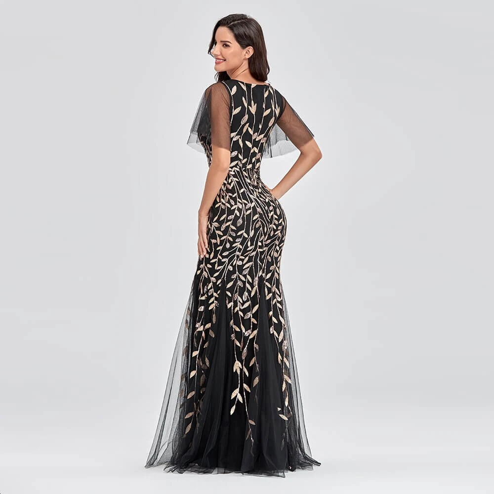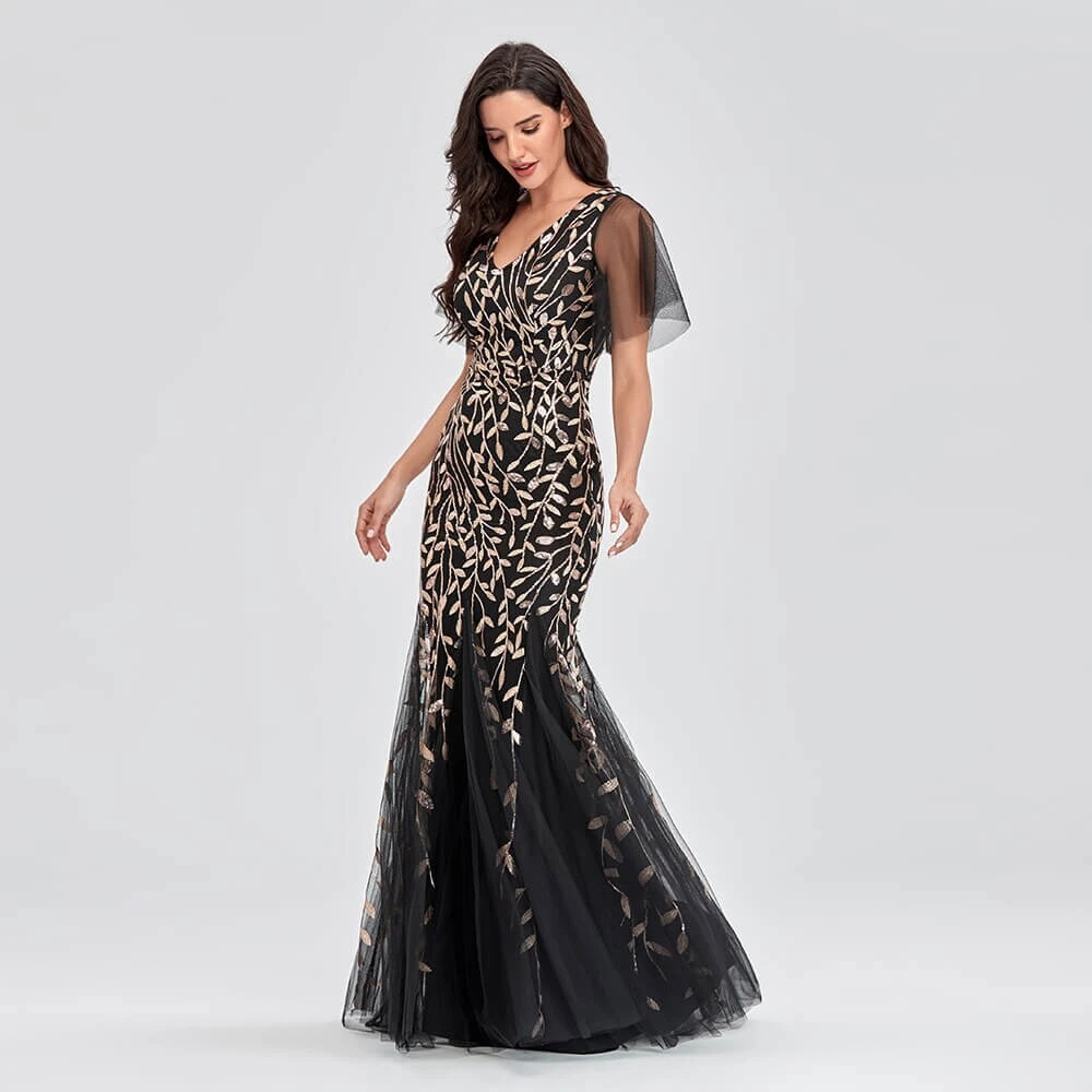 Adoptez un look de princesse avec cette robe de bal composé d’une broderie florale, d’un voilage en tulle et d’un bustier en dentelle. Sa couleur sombre fera ressortir vos traits de visage, ainsi que vos éventuels bijoux si vous souhaitez être une véritable princesse. Sa longue coupe s’inspire des modèles sirènes, qui ont grand succès pour les soirées festives.