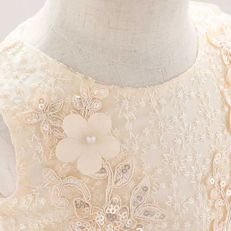 Laissez votre bébé s’immerger dans un monde magique et imaginaire dans cette fabuleuse robe de princesse, qui sera idéal à porter lors d’une cérémonie de baptême, ou encore d’un mariage. Constituée d’une broderie en dentelle douce, le motif floral se présentant sur le bustier et le voilage de la robe rend ce vêtement de princesse unique !