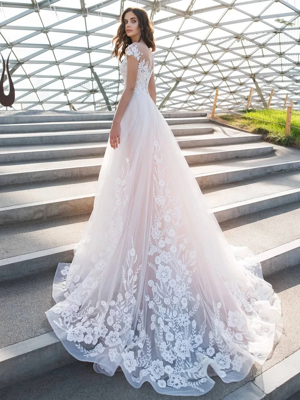 La somptueuse jupe en tulle avec une longue traine assure une apparence inoubliable et royale, tandis que le corsage en dentelle transparente permet une harmonie remarquable. La couleur ivoire de cette robe lui procure une originalité et une beauté très appréciée par les femmes modernes.