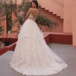 Une robe composée de tissus inattendus rehausse totalement ce modèle en tulle avec des empiècements en dentelle et en maille. Avec des motifs uniques le long de la robe en cascade et un décolleté en cœur plongeant orné de dentelle baroque. Cette robe de mariée parfaite et artisanale vous comblera de beauté lors de ce jour si important pour une femme.