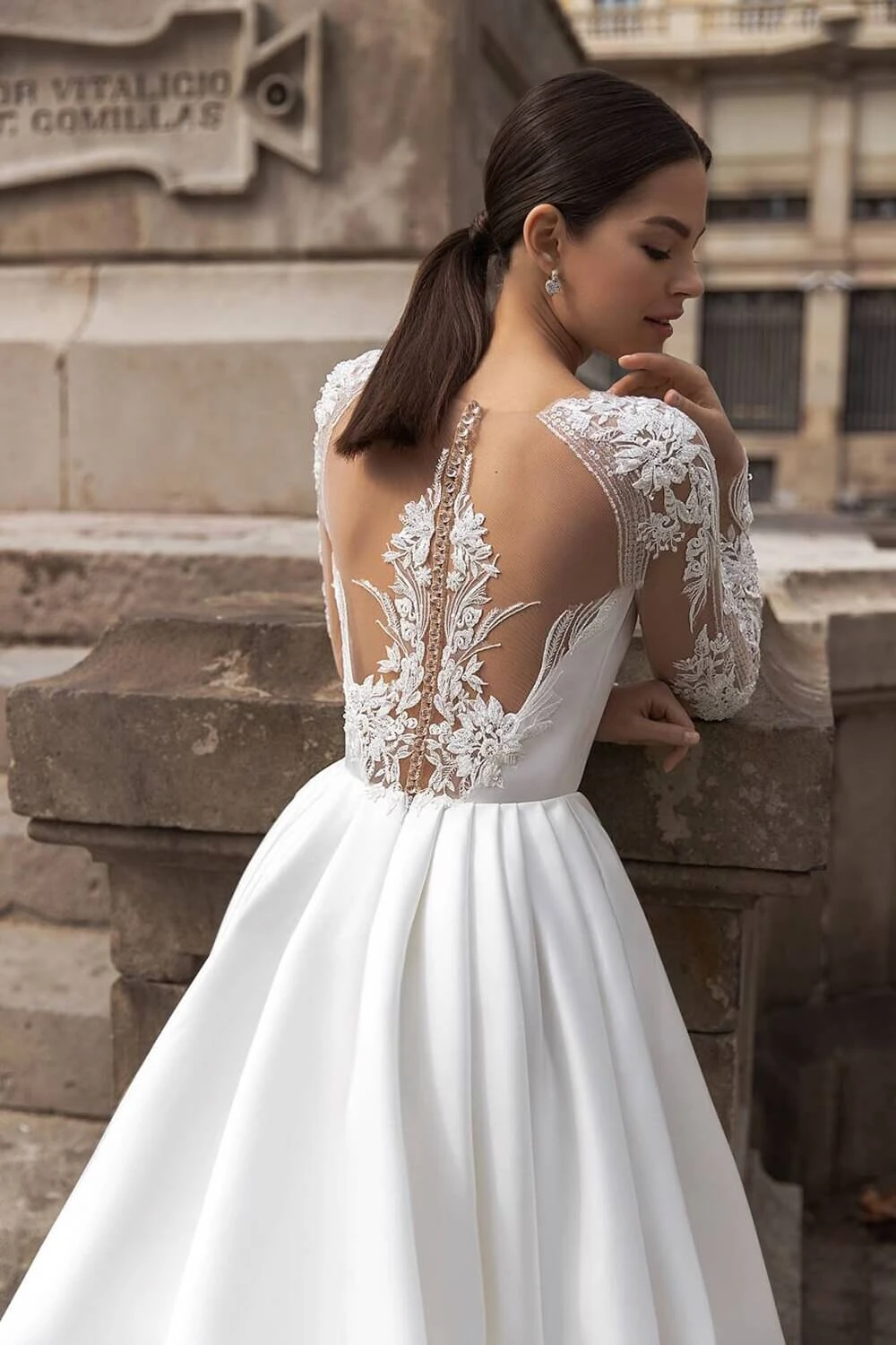 Cette robe de mariée incarne l’élégance et la pureté des princesses grâce à sa couleur antique blanche, et sa composition en satin doux de grande qualité style drapée pour un somptueux rendu. Son dos et ses manches longues illusions ne vous laisseront pas passer inaperçu aux yeux de votre entourage, et surtout de votre prince charmant.