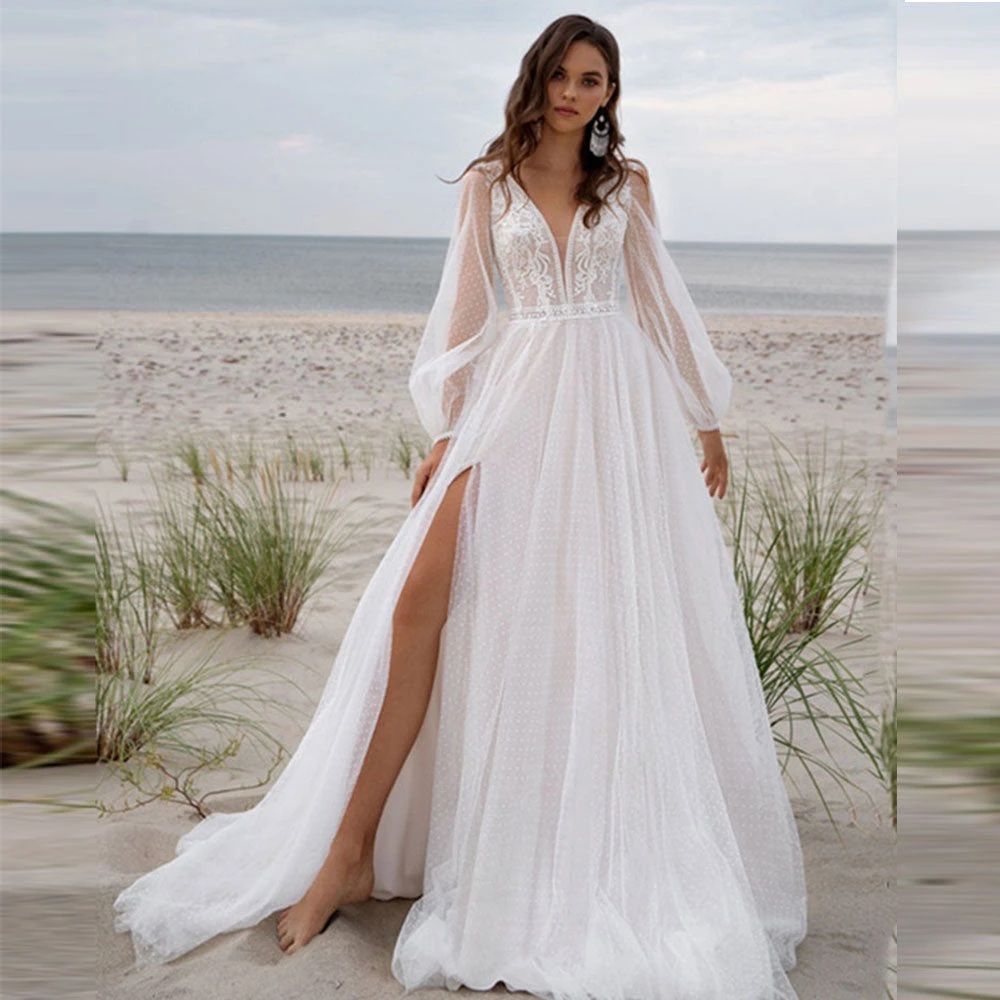 Une robe de mariée de plage aérée en tulle et en dentelle, qui soufflent en harmonie avec les cheveux dans le vent doux. Des coupes fluides et des designs simples adaptés à l’été sont parmi les attributs les plus importants. Cette tenue de mariée est élégante et aérée avec un décolleté profond pour parfaire pour votre mariage à la plage.