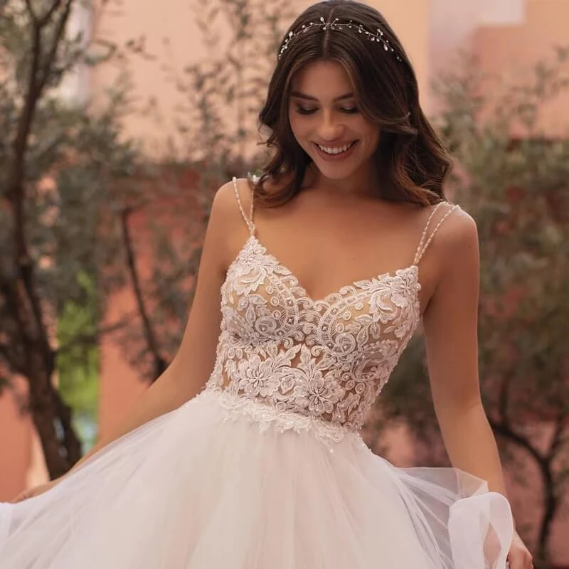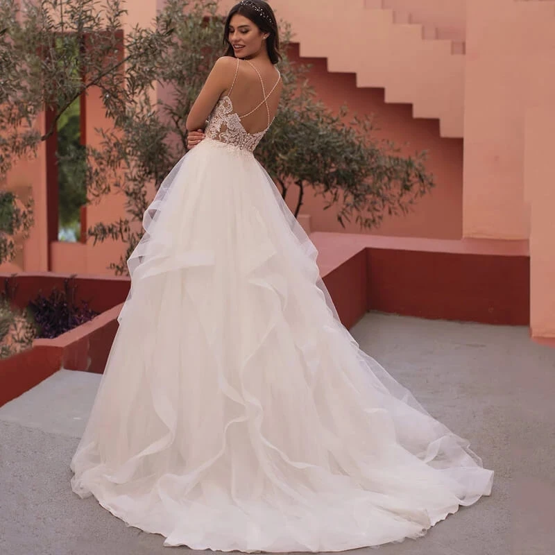Le point fort de ce modèle est la jupe de style princesse à volants en tulle, et son bustier brodé de motifs floraux en dentelle qui embellissent magnifiquement la tenue en apportant du mouvement. Le corsage présente un décolleté élégant et raffiné et les fines bretelles dessinent un motif en forme de croix qui encadre le dos découvert.